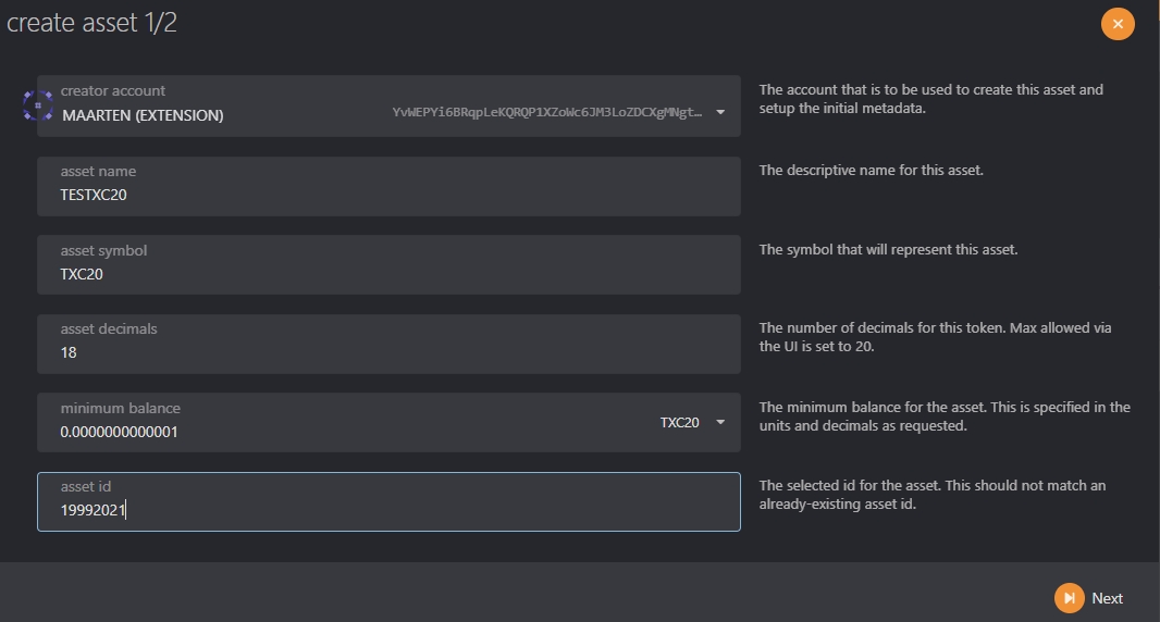 Enter the asset name, asset symbol, and set the number of decimals for the asset. This doesn't have to be 18 decimals like the network native assets, it's completely configurable.