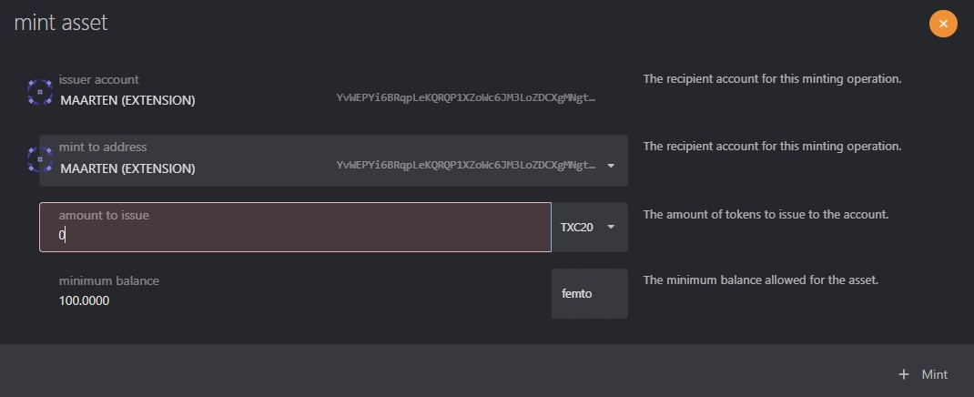 The asset is now created on our network, but has no supply. To mint the tokens, click on the +Mint button next to the asset to open the mint pop-up.