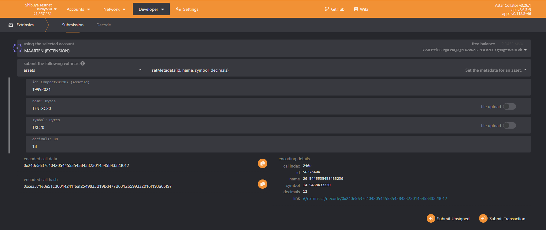setMetadataextrinsicEnter the asset id from the asset you created before